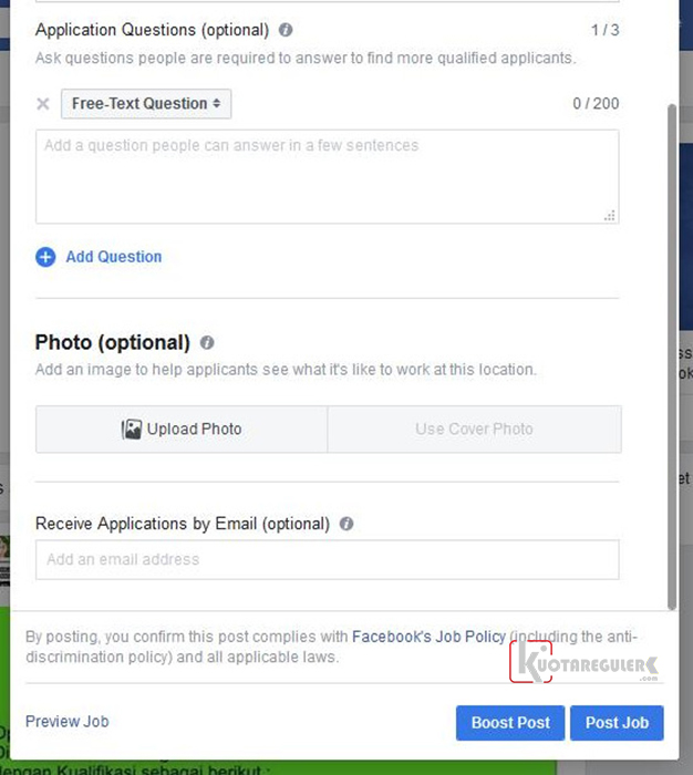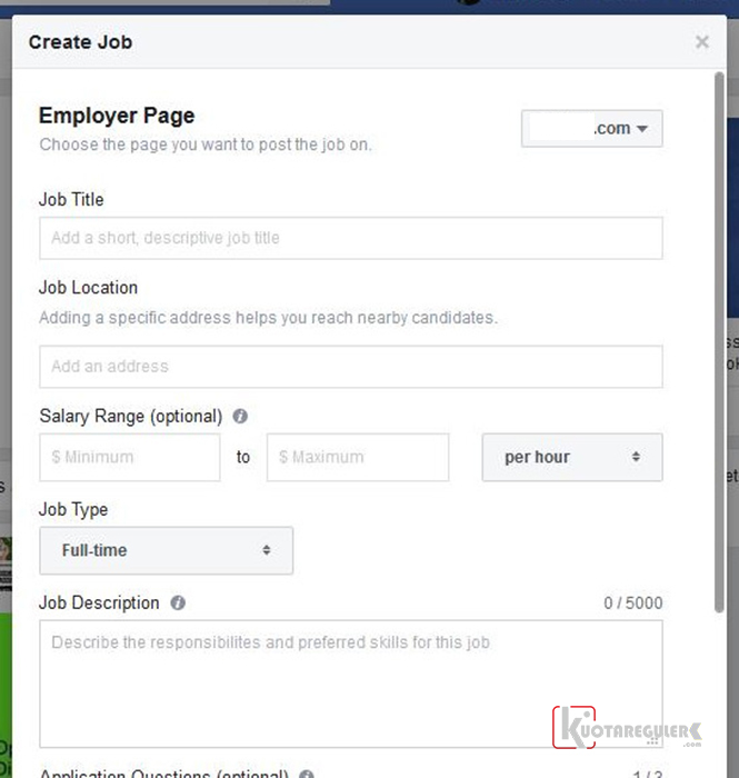 Application Question merupakan pertanyaan pendahuluan yang bisa Anda layangkan kepada pengguna Facebook yang berniat melamar pekerjaan. Pertanyaan-pertanyaan yang dilayangkan berupa pertanyaan dengan tipe jawaban bebas dan jawaban iya atau tidak. Selain membuat pertanyaan pendahuluan, yang cukup penting untuk dicantumkan atau dimasukkan dalam lowongan pekerjaan tersebut adalah foto lokasi atau kantor Anda.