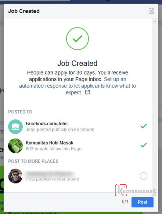 Jika semua data, pertanyaan dan lain sebagainya telah Anda isi, maka langkah terakhir untuk membuka lowongan kerja di Facebook Jobs adalah dengan meng-klik tombol Post Job. Setelah menekan tombol tersebut, maka lowongan Anda akan ditayangkan di halaman Facebook Job dan di Fan Page milik Anda. Supaya informasi mengenai pekerjaan ini bisa tersebar dengan jangkauan yang luas, maka Anda pun perlu aktif dengan menyebarkan informasinya melalui sosial media pribadi.