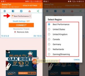 3. Kemudian pada halaman utama Anonytun anda bisa memilih server VPN yang akan digunakan. Ada beberapa server yang tersedia yaitu United States, United Kingdom, Canada, Germany dan Netherlands. Atau anda bisa memilih Best Performance yang artinya anda nantinya akan di beri server VPN secara acak dari beberapa negara.