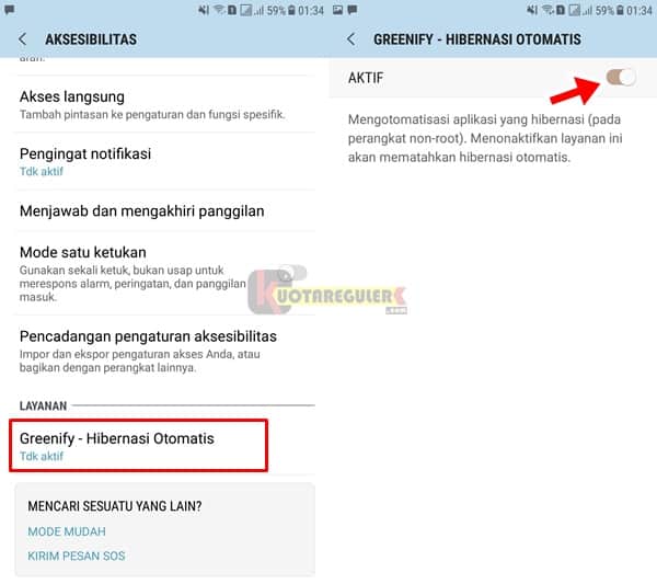 5. Untuk anda yang baru pertama kali menggunakan aplikasi Greenify, anda akan di arahkan ke Pengaturan ponsel Aksesbilitas. Silahkan scroll ke bagian bawah, lalu aktifkan Layanan Greenify. Lihat gambar dibawah ini.