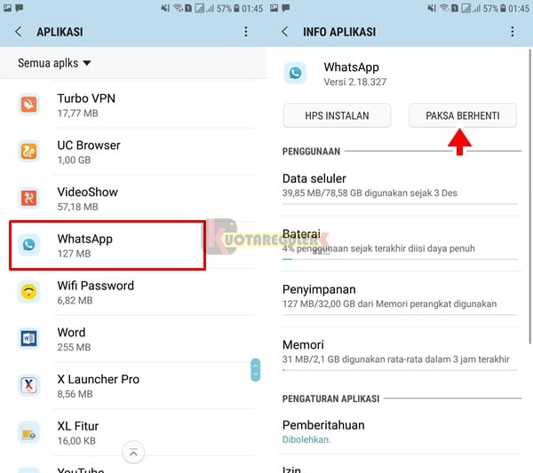 3. Kemudian silahkan anda cari aplikasi WhatsApp lalu pilih Stop / Paksa Berhenti. Lihat gambar dibawah ini.