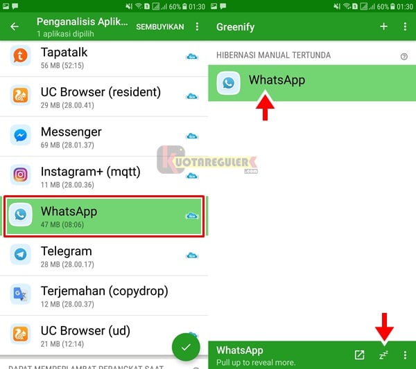 4. Kemudian akan muncul status HIBERNASI MANUAL TERTUNDA. Seleksi kembali aplikasi WhatsApp-nya lalu tap icon Zzz yang ada dibagian bawah, jika muncul notif pilih lanjutkan. Lihat gambar dibawah ini.