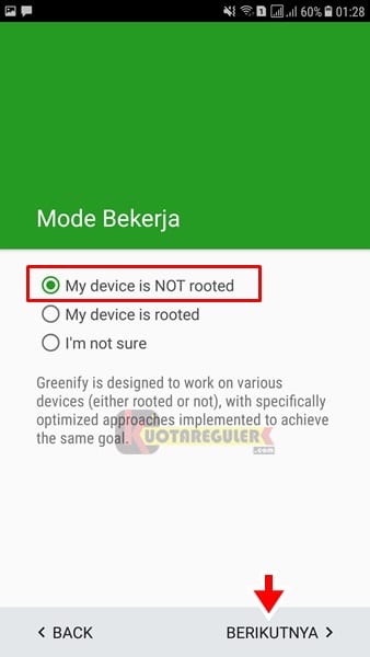 2. Selanjutnya silahkan anda jalankan aplikasinya. Pada saat pertama kali di buka silahkan tap tombol Berikutnya. Selanjutnya akan muncul pertanyaan Mode Bekerja, pilih My device is NOT rooted (untuk yang ponselnya belum root) dan pilih My device is rooted (untuk yang ponselnya sudah dalam keadaan root). Admin akan mencohtohkan menggunakan ponsel yang berlum root. Jika sudah tap tombol Berikutnya sampai Finish.