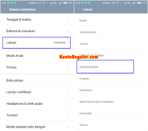 4. Masih di pengaturan, sekarang ubah lokasi ponsel kita dan samakan dengan Zona waktu yang telah kita pilih pada langkah nomor 3. Karena admin memilih zona waktu Los Angeles maka lokasi admin akan memilih negara Amerika Serikat.