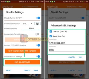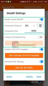 3. Kemudian, setelah kartu Axis kalian bisa mengakses URL tersebut pada langkah nomor 2, langsung saja buka aplikasi Anonytunnya. Lalu langsung coba konekan, pasti masih connecting failed. Keluar dari aplikasi Anonytun ubah dulu jaringan ponsel kalian ke 2G / E melalui Pengaturan ponsel. Kemudian masuk ke Anonytun lagi dan coba konekan, dan diskonekan lagi, langsung masuk Stealth Settings. Lalu atur seperti gambar dibawah ini: