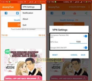 5. Di halaman awal Anonytun pilih menu titik 3 di bagian sudut kanan atas, lalu pilih VPN setting kemudian silahkan konfigurasi MTU Size seperti dibawah ini: