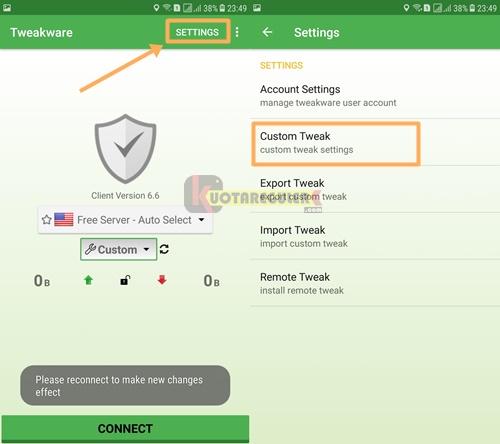 2. Lanjut, jika sudah terinstall maka jalankanlah aplikasi Tweakware dan pada halaman utama pilih SETTINGS lalu pilih Custom Tweak. Ini tujuannya untuk membuat sambungan khusus.