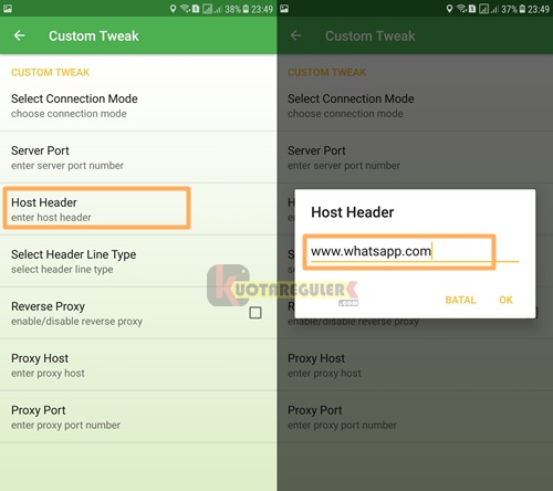 5. Selanjutnya tap Host Header lalu silahkan kalian masukan URL bug chat dan social media Telkomsel seperti “www.whatsapp.com” / “v.whatsapp.com” tanpa petik.