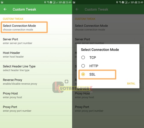 3. Pada halaman Custom Tweak pertama ubah Select Connection Mode menjadi SSL.