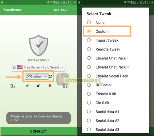 6. Selain yang admin sebutkan di atas, tidak perlu di atur lagi. Langsung saja back ke halaman utama Tweakware lalu ubah terlebih dahulu jenis Tweak yang akan di jalankan. Tap icon kuci pas lalu pilih Custom. Ini tujuannya untuk mengaktifkan koneksi yang telah kita atur tadi dari langkah nomor 3 samapi 5.