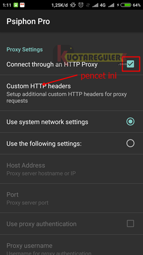 5. Lalu masuk ke menu More Option scroll ke bagian PROXY SETTING kemudian ceklis Connection through an HTTP Proxy. Ceklis juga Use system network settings. Selanjutnya tap tulisan Custom HTTP headers.