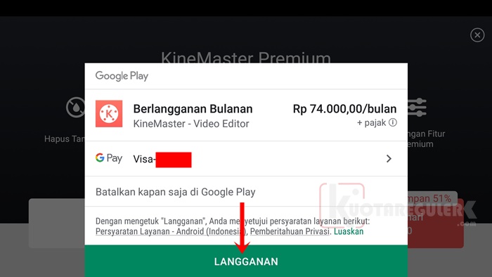 - Kemudian akan muncul pop-up metode pembayaran anda di Google Play. Jika anda sudah memverifikasi metode pembayaran di Google Play maka anda tinggal pencet tombol berlangganan.