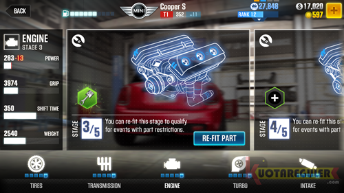 Untuk meningkatkan performa mobil, lakukan upgarde untuk semua komponen part mobil anda dari mulai engine, transmission, turbo, intake, tires, nitrous, body dan lainnya. Setiap stage memiliki lawan dan mobil yang berbeda.